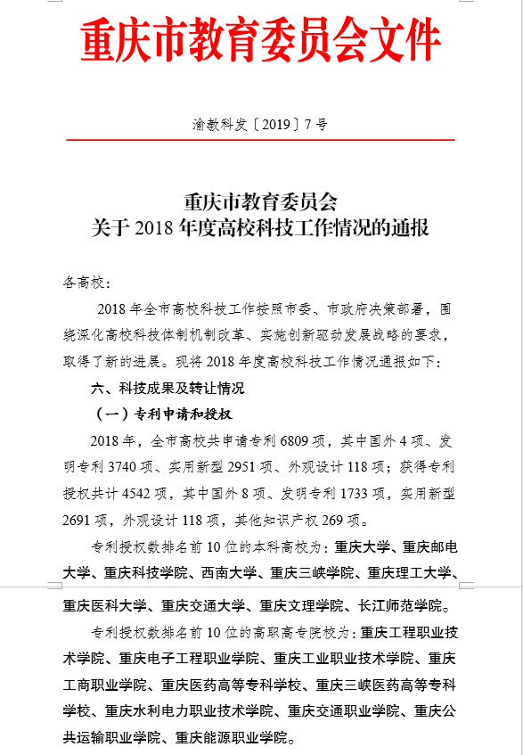 本网讯(科研处余敏芳、党委宣传部李晗)重庆市教委近日下发专门通知,通报2018年全市高校科技工作新进展,在科技成果及转让情况专利申请和授权一项中,学院以专利授权110项的成绩名列重庆市高职高专院校前列,从一个侧面反映学院在科技创新工作上取得新的突破。