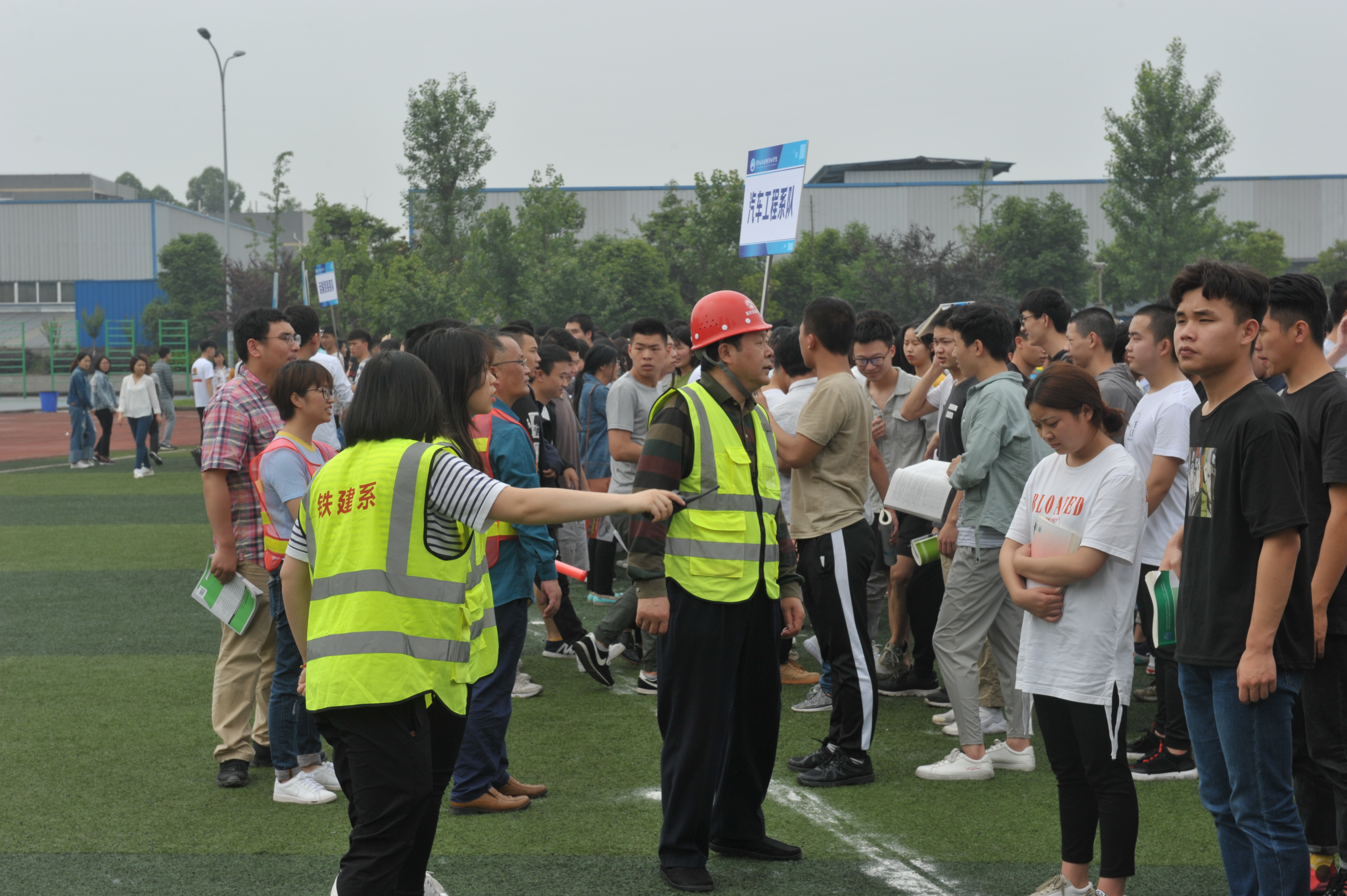 在地震避险环节,随着地震警报响起,全校各班级教师、宿舍生活老师、实训车间教工、办公室工作人员立即进入应急状态,各楼层疏导员现场指挥、指导、指引师生就近选择安全防护措施进行避险。当第二次地震警报响起,全体师生及教职员工在区域指挥员的引导下,从各个疏散通道迅速撤离至学院足球场,各支队伍负责人逐一向本次应急演练总指挥邱发胜副校长报告人员疏散情况。