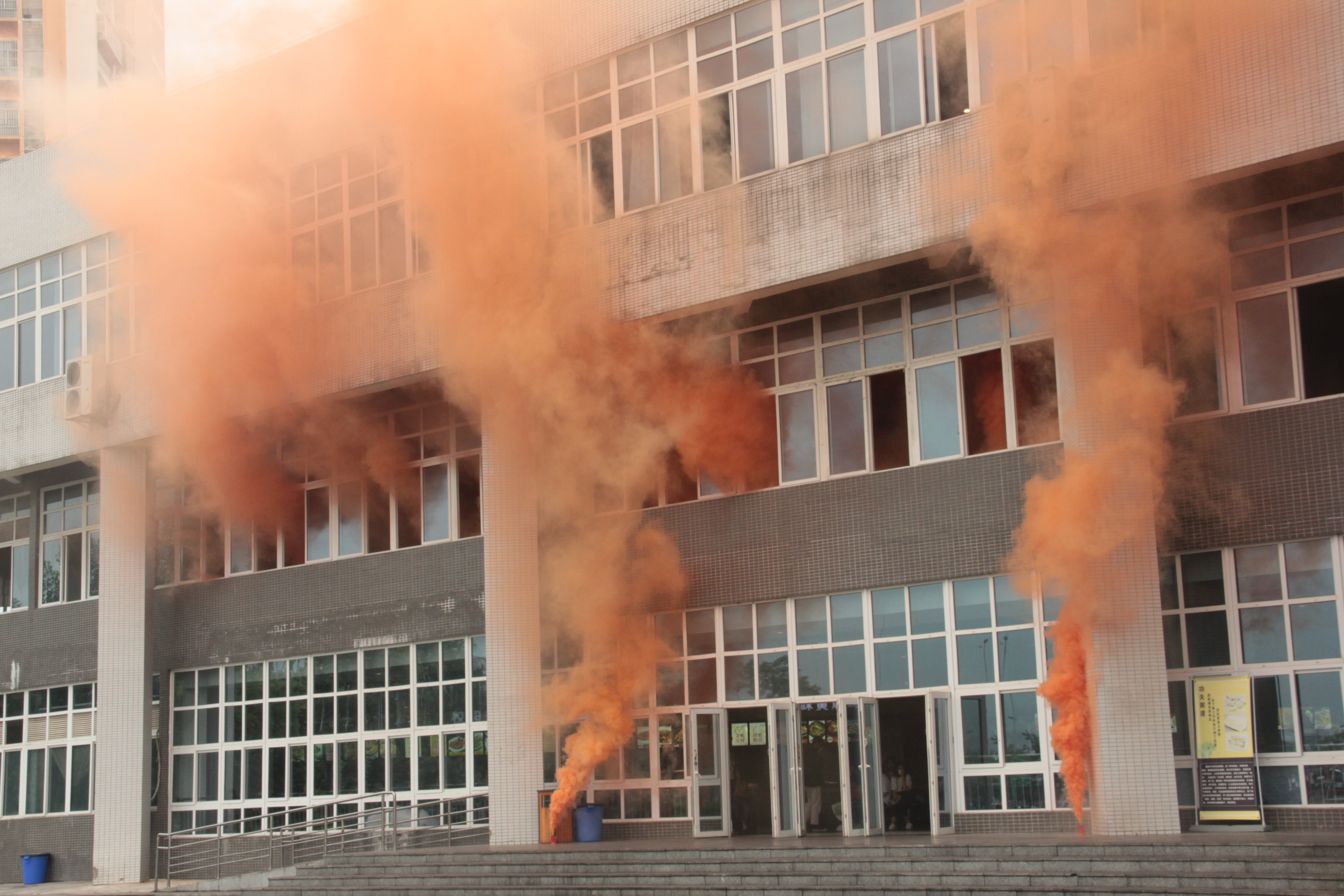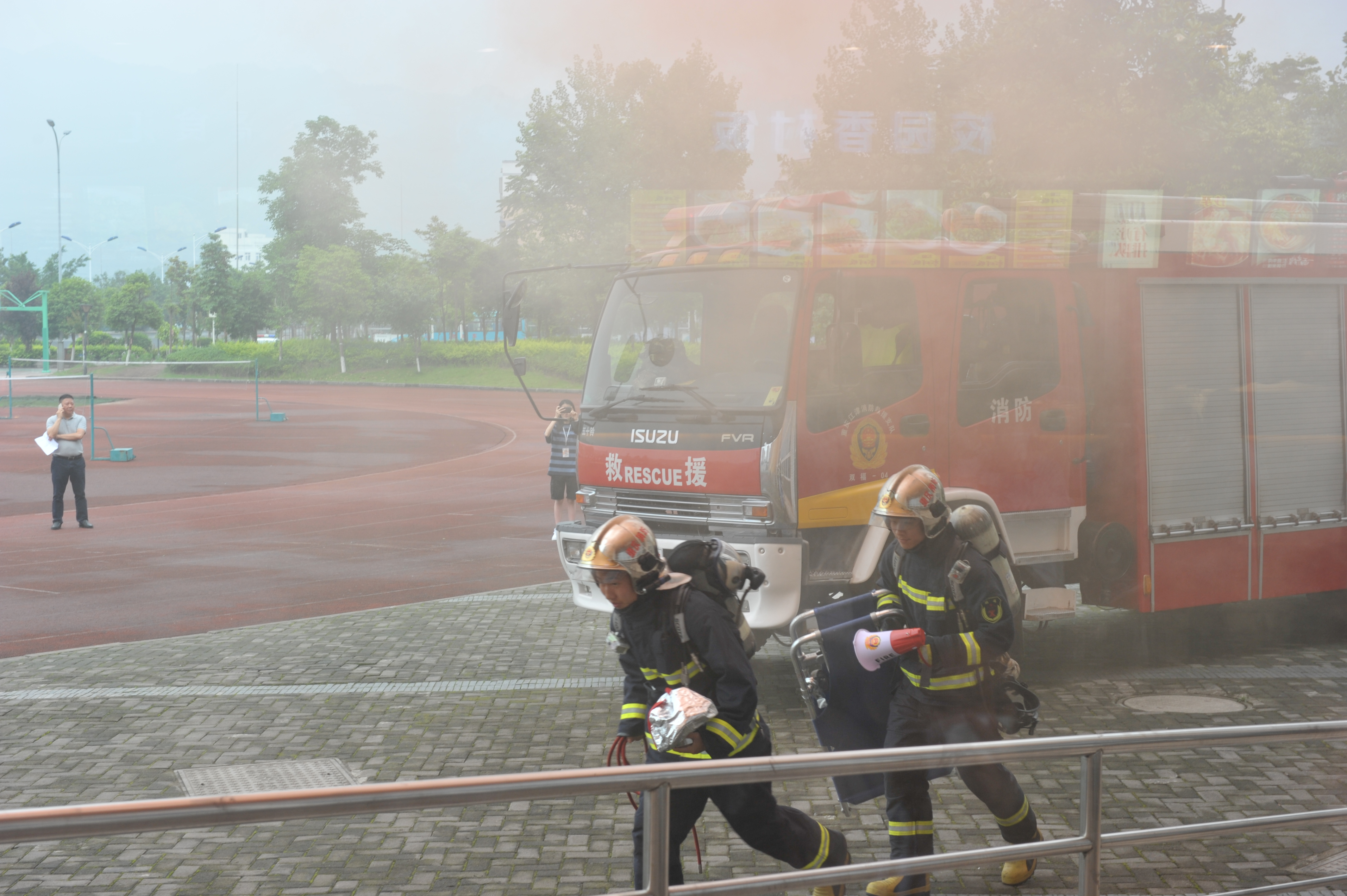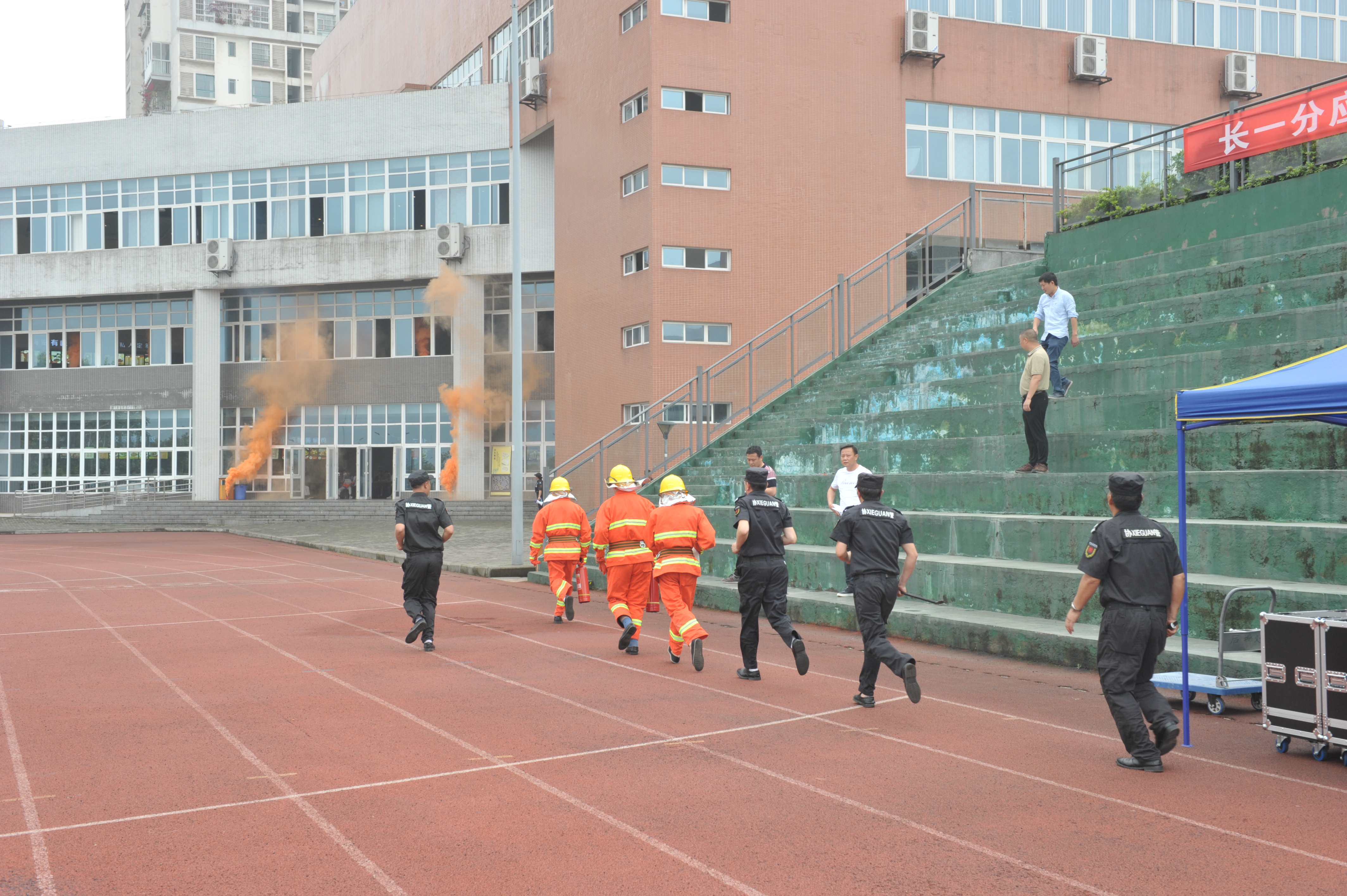 李灿等学院领导班子成员,全院师生员工,新大正物业全体员工,共6000多人参加演练。