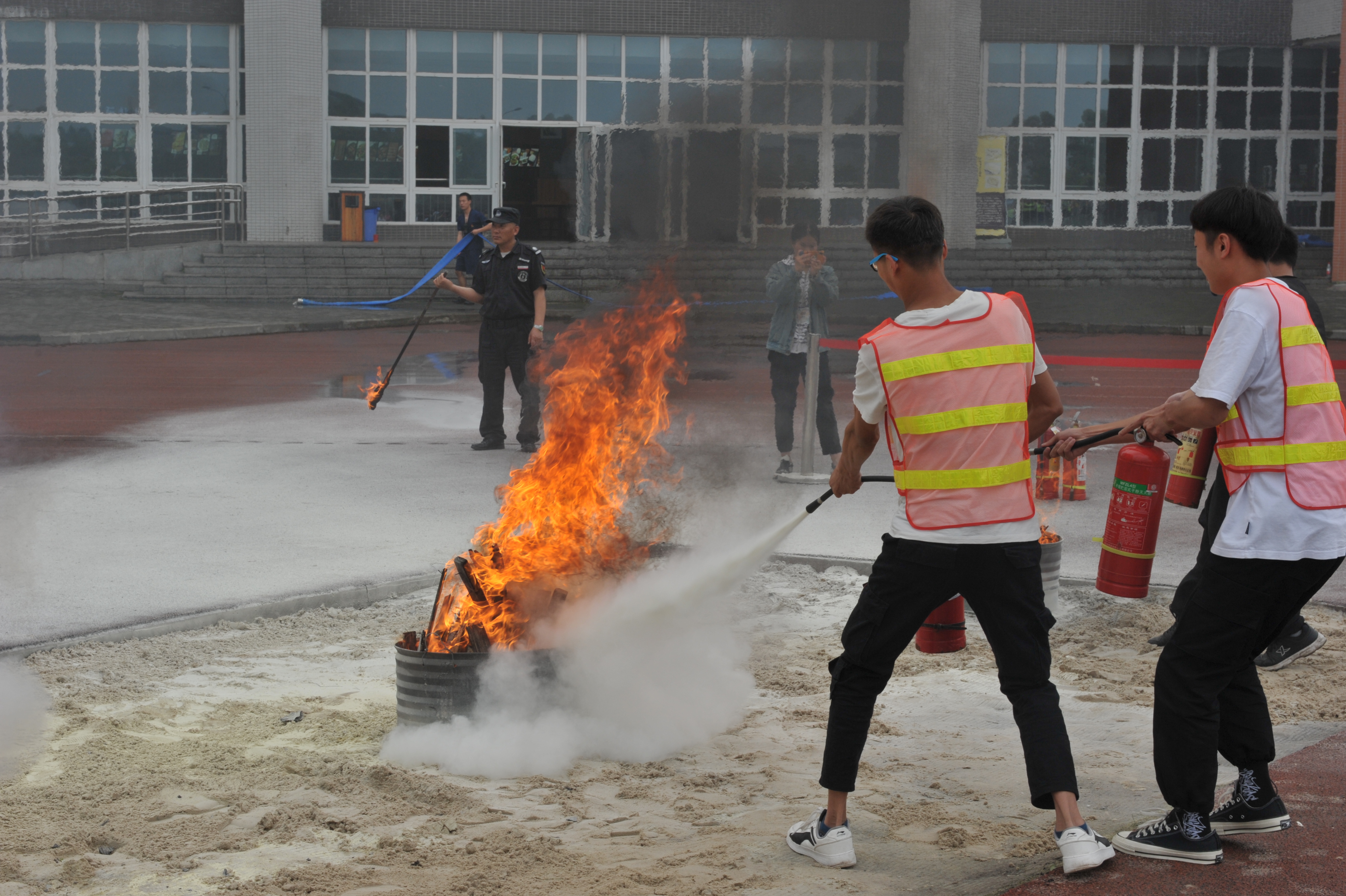 活动中,还从各单位随机抽选2名人员,利用手提干粉灭火器,进行现场灭火演练。