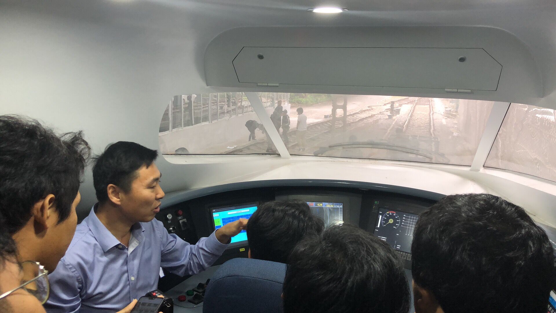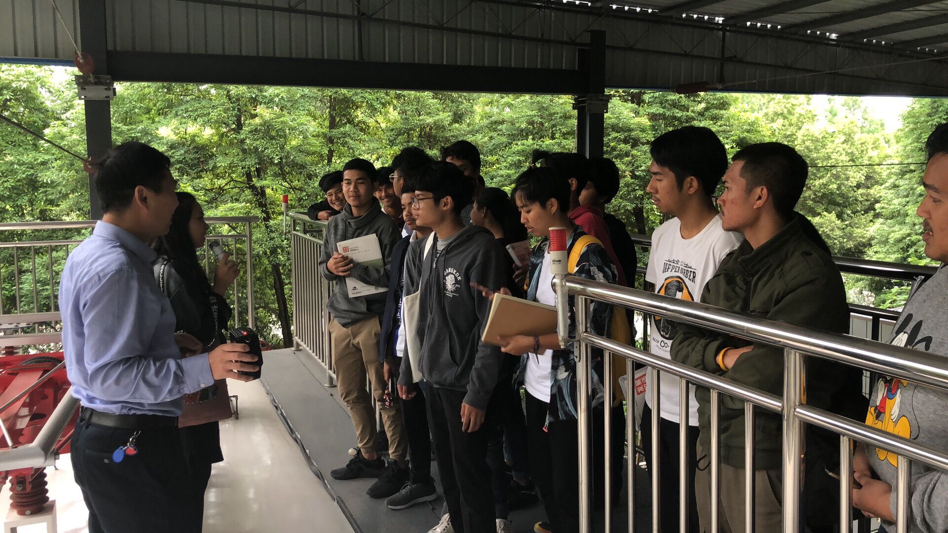 在实地查看环节,43名留学生来到学院城轨高铁技术共享实训基地,听取相关专家对高铁相关实训设施设备、车辆驾驶注意事项等方面情况讲解。
