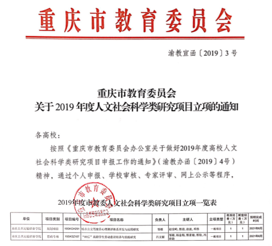 本网讯(科研处陈艳、党委宣传部李晗)近日,市教委下发专门通知,公布2019年度人文社会科学类研究项目立项名单,我院申报的2项目榜上有名,获批立项。