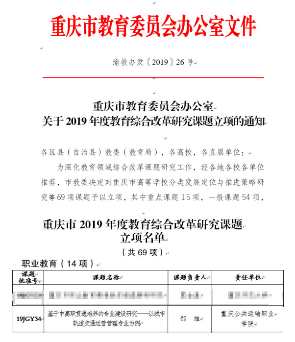 当前位置:首页 > 新闻中心 > 学校动态 > 学校动态 重庆运输职院首次获批市教育综合改革研究课题立项 来源:学校动态发布时间:2019-05-30 09:34访问量: 本网讯(科研处 陈艳)近日,市教委下发专门通知,公布2019年度教育综合改革研究课题立项名单。我院1项目获批一般项目立项,实现我院在此类项目中的新突破。 获批立项的项目为运输贸易系邹雄老师申报的《基于中高职贯通培养的专业建设研究——以城市轨道交通运营管理专业为例》。 全市共有69项课题获批2019年度教育综合改革研究课题,包括重点课题15项、一般课题54项。