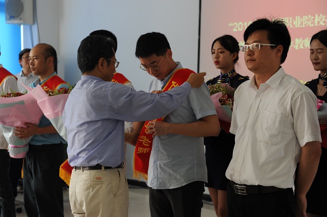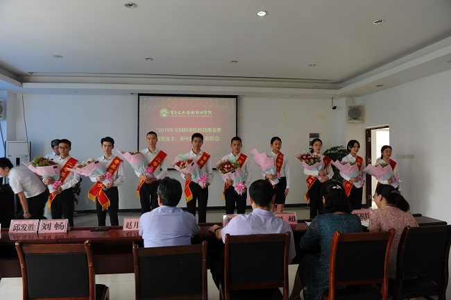 会上,宣读学院党委《关于表彰“2019年全国职业院校技能竞赛”获奖学生和指导教师的决定》,出席会议的学院领导班子成员,分别为夺得2019年全国职业院校技能大赛高职组金奖、银奖、铜奖的获奖师生代表授带、献花、颁奖。