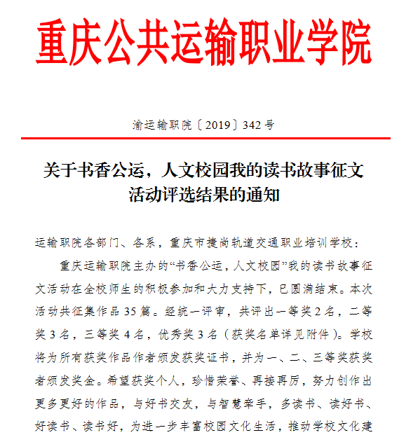 本网讯(党委宣传部 李晗)7月1日,由学院党委宣传部、图书馆、学生处联合举办的“书香公运,人文校园”我的读书故事征文活动评选结果揭晓。活动共评出一等奖2名、二等奖3名、三等奖4名、优秀奖3名。