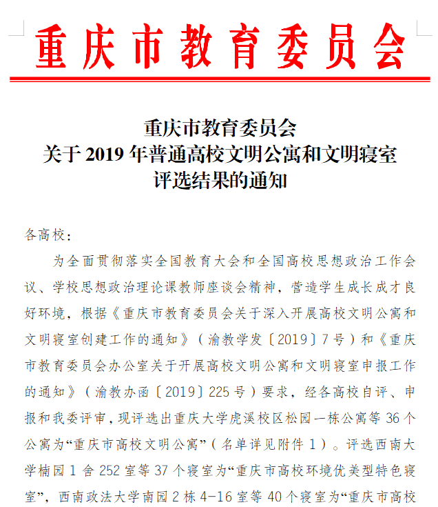 本网讯(党委宣传部文月工)重庆市教育委员会7月15日发出专门通知,通报2019年普通高校文明公寓和文明寝室评选结果,重庆交通开投集团所属澳门正规电子游戏平台榜上有名,共有7个学生寝室被评为2019年普通高校文明寝室。