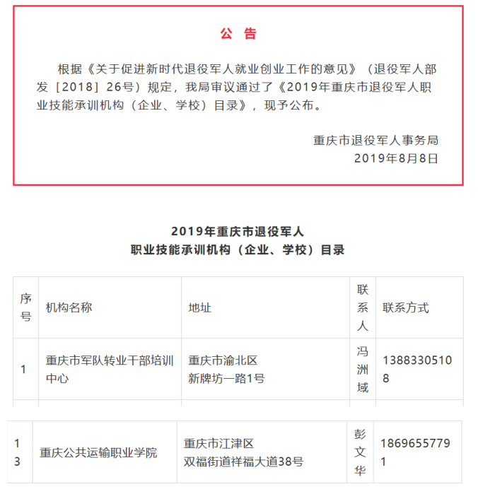 据了解,退役军人职业技能承训机构(企业、学校)目录,是重庆市退役军人事务局为贯彻落实退役军人事务部等12 部委《关于促进新时代退役军人就业创业工作的意见》,着眼实现退役军人应训尽训、稳定就业,按照单位申报、区县退役军人事务部门初评推荐、市退役军人事务局就业创业处和市军培中心评估审核、市退役军人事务局审批的程序确定的。该目录实行动态管理,没有进入目录的学校(企业、培训机构)不得承担培训任务。