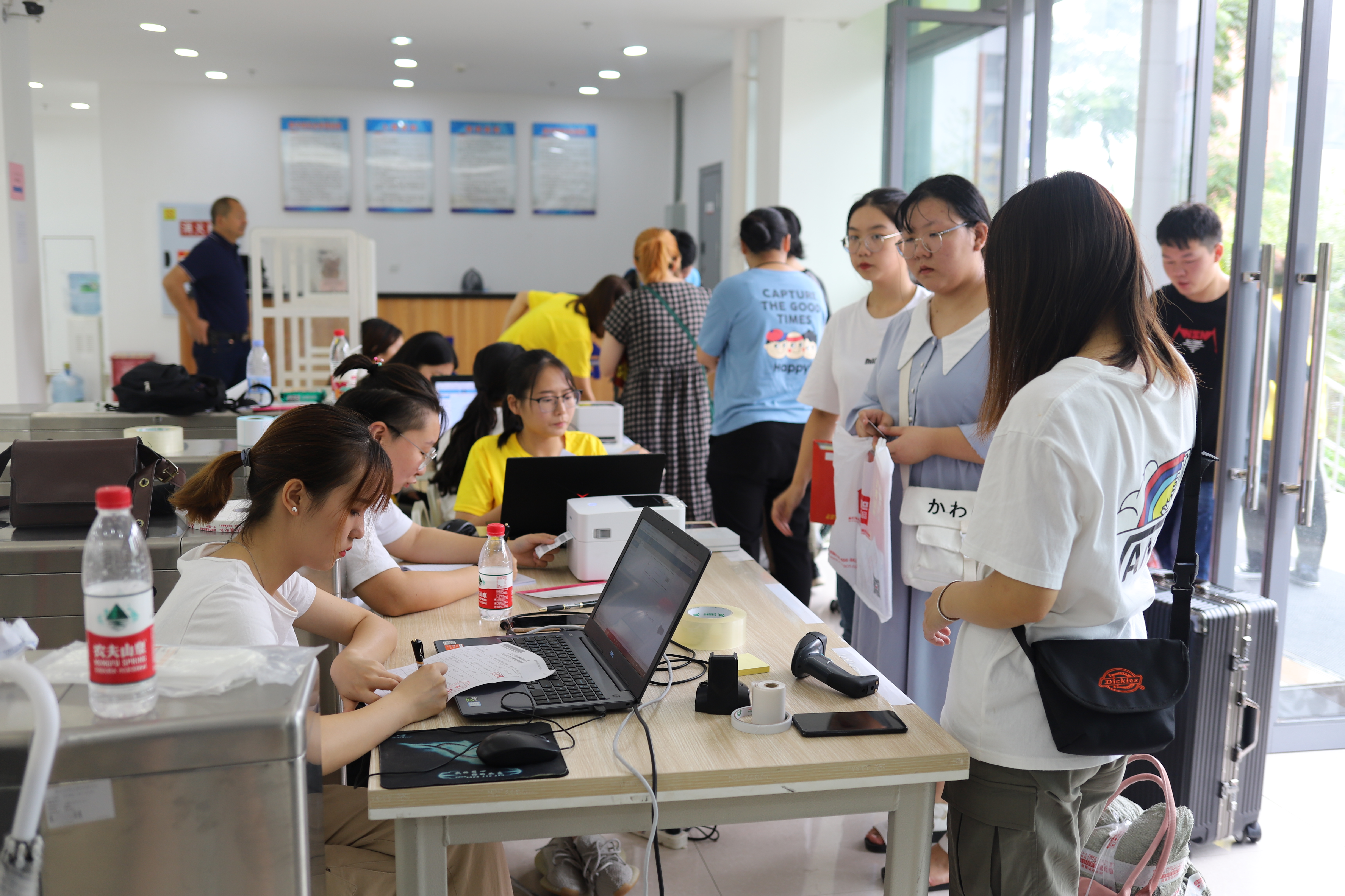 值得一提的是,本次迎新还启用“数字迎新系统”,新生通过扫描自己的身份证,就能完成学生分班分宿舍、数据统计等报到流程。同时,新生还可通过工行E银,实现网上缴费,通过网络提交型号报备发放军训服装,按智能化标签自动生成行李存放条码,通过扫描报到单二维码自动统计乘车信息,一键搞定乘车安排,为新生报到提供更便利、更人性化的服务,受到家长和学生好评。