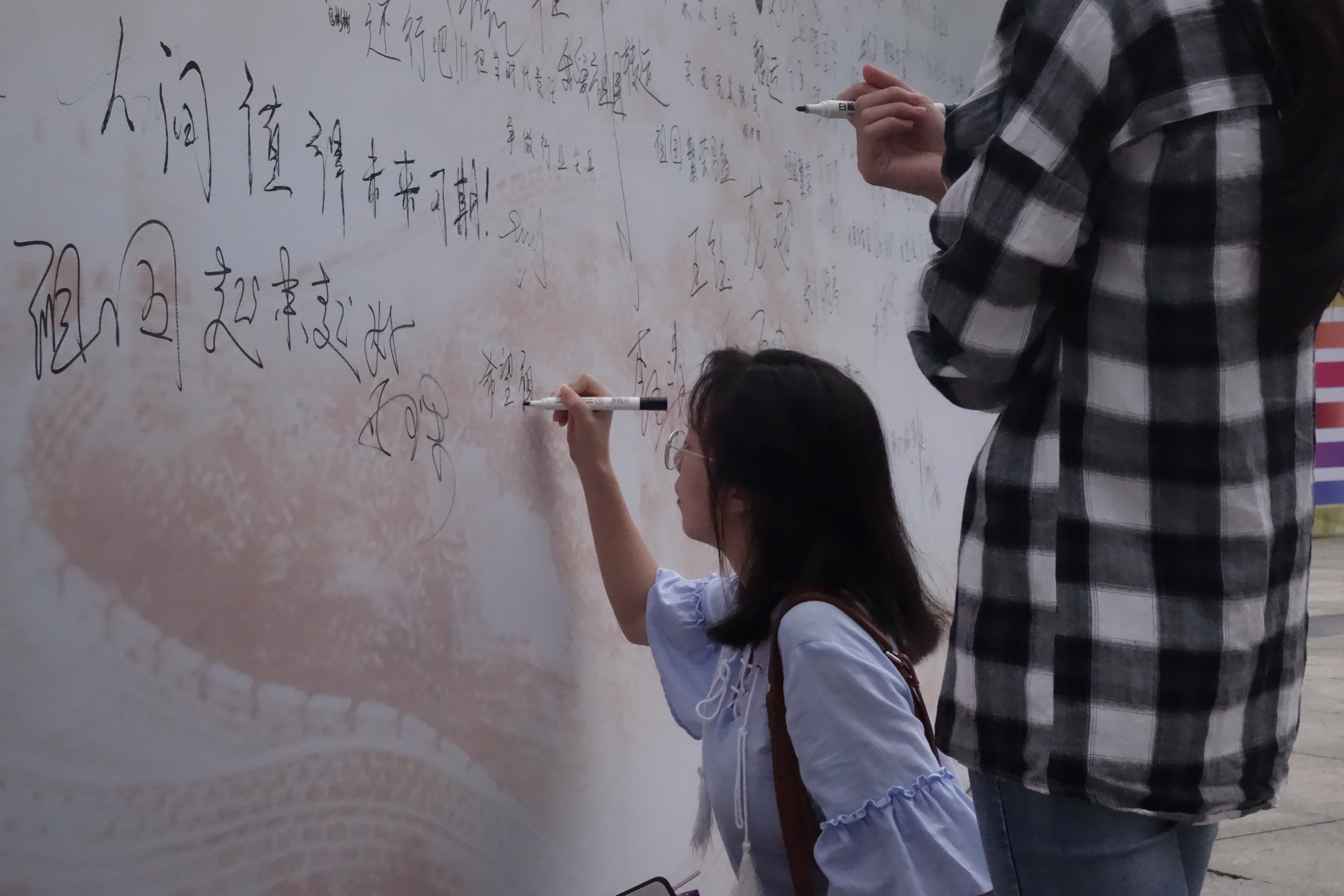 活动中,学院在校内中心位置,设置“祖国,我想对您说说心里话——2019级新生庆祝新中国成立70周年”大型主题签名墙,让每一位新生在办理各项手续前,在签名墙上写上自己的心里话,签上自己的名字和对祖国母亲的深情祝福,增强大学生活的仪式感和对祖国的自豪感。