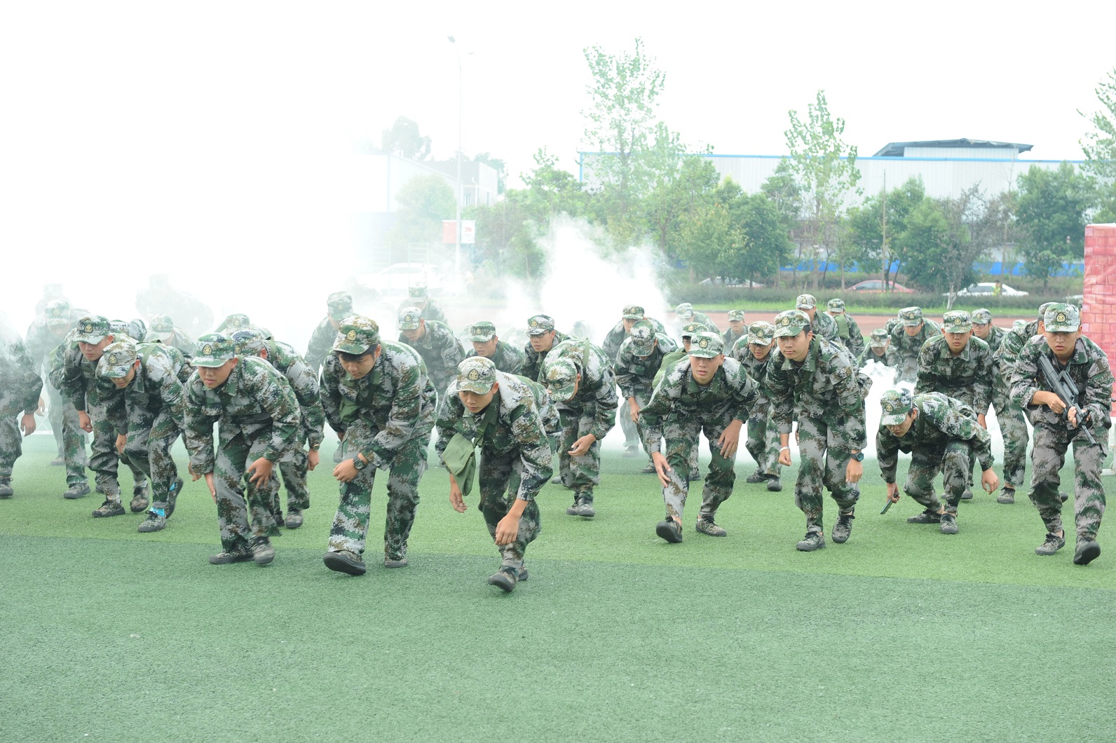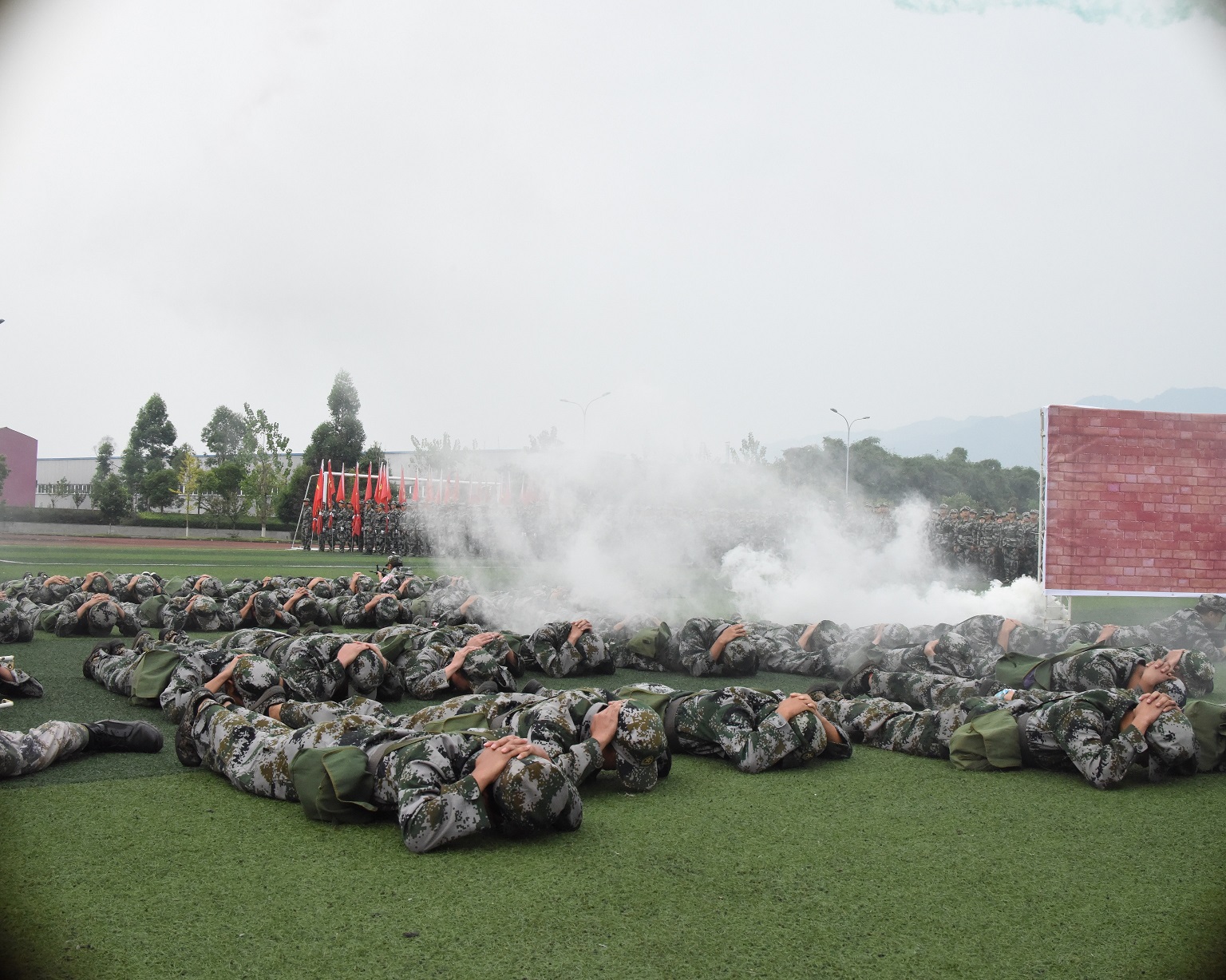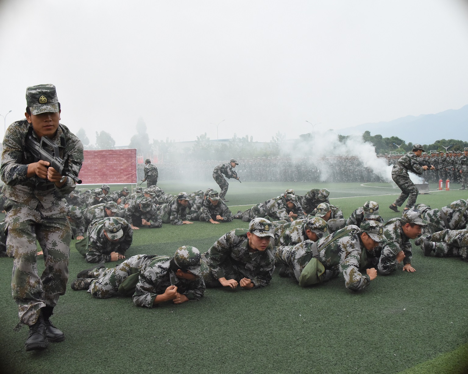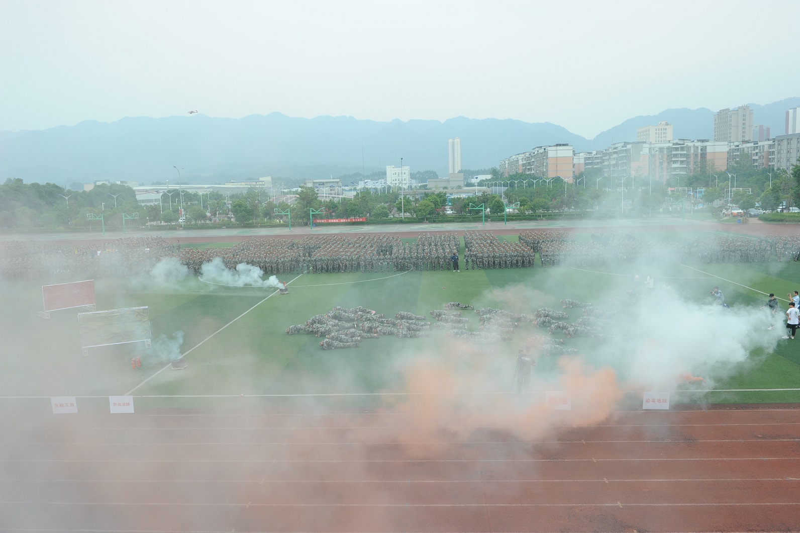 重庆市人民防空办公室应急处处长毛赧百、解放军重庆市江津区学生军训工作办公室参谋赵海兵、江津区人民防空办公室副主任孔令兵,学院领导班子,各单位各部门负责人,全体2019级新生及教官等,共2000多人到场观摩演练。