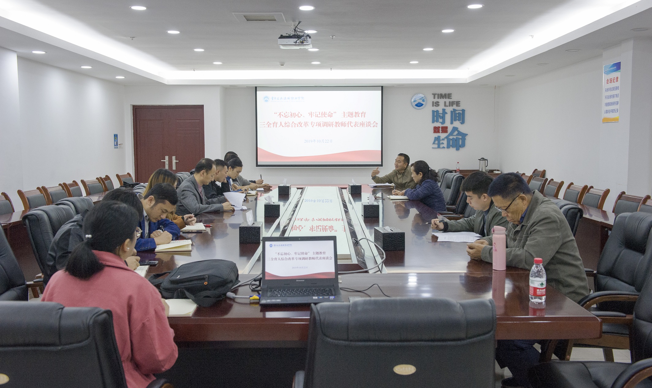本网讯(文/党委宣传部李晗,图/彭露娇)为全面了解《“三全育人”实施方案》印发后相关工作推进情况,听取意见建议,进一步落实立德树人根本任务,根据“不忘初心、牢记使命”主题教育工作安排,10月22日上午,重庆交通开投集团所属重庆运输职院在办公楼507会议室,召开“不忘初心、牢记使命”主题教育“三全育人”综合改革专项调研教师代表座谈会。