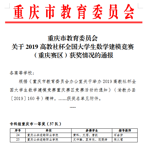 本网讯(党委宣传部李晗)近日,重庆市教委发布专门通报,公布2019高教社杯全国大学生数学建模竞赛(重庆赛区)获奖情况,重庆交通开投集团所属澳门正规电子游戏平台两支代表队斩获专科组一等奖。