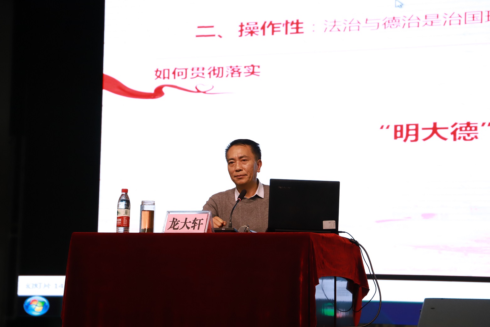 活动邀请西南政法大学教授、博士生导师龙大轩,以《坚持依法治国与以德治国相结合》为题,为大家作了一场高水平专题报告。报告从坚持依法治国与以德治国相结合的必然性、操作性、合理性等方面,对中国从古至今法治与德治的发展进行了梳理,详细分析法治与德治分合所带来的影响。指出,坚持法治与德治相结合是是总结几千年治国理政经验智慧的结晶,是伟大时代作出的重大部署,必将指引我们沿着中国特色社会主义法治道路奋力前进。