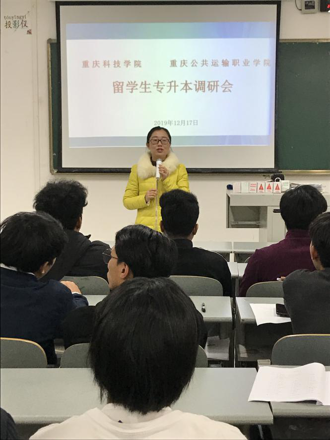 在教学楼C栋205教室举行的调研座谈会上,重庆科技学院外事处处长董倩详细介绍重庆科技学院办学特色、专升本要求、入学考核及奖学金设置等情况,机械电子工程专业负责人雷贞贞博士就该校专升本专业及其课程设置举行说明,并就留学生专升本相关事宜进行现场答疑。