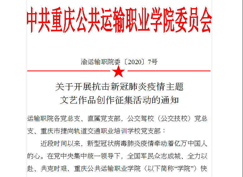本网讯(党委宣传部文月工)为充分激发万众一心打赢疫情防控阻击战的信心和决心,2月10日,重庆交通开投集团所属重庆公共职业学院党委发出专门通知,确定由党委宣传部、党委学生工作部联合面向全院师生、学生家长及校友开展抗击“新冠肺炎”疫情主题文艺作品创作征集活动。