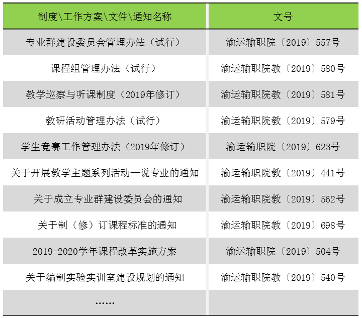制订下发《教学质量提升行动计划》(2019-2020),设立5大板块,30个任务,对如何提升学院教学质量明确了目标。制(修)订相关教学管理制度9个,印发工作方案、文件14个。组建10个专业群委员会,按照“三个对接”原则,组织制(修)订2019级人才培养方案30个,组织完成成都铁路局“工电供一体化”改革的人才培养方案制定,增设“高铁综合维修技术”“人工智能技术服务”2个新专业。举办全院“说课比赛”和“说专业”活动,营造浓厚教学氛围,健全院-系两级巡查机制,优化教学监督体系。