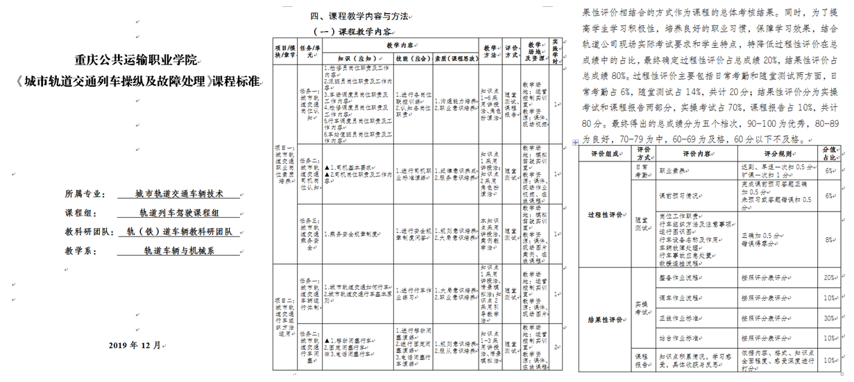 拟制课程改革实施方案(2019-2020学年),形成学院、教科研团队、各课程开展改革详细计划,立项教学方法、信息化教学、考核方式改革三个类型共48门课程,作为改革试点示范课。将课程思政、1+X、课程改革的元素融入课程标准,全面修订课程标准。