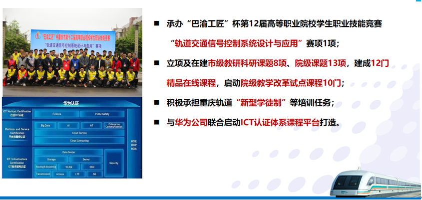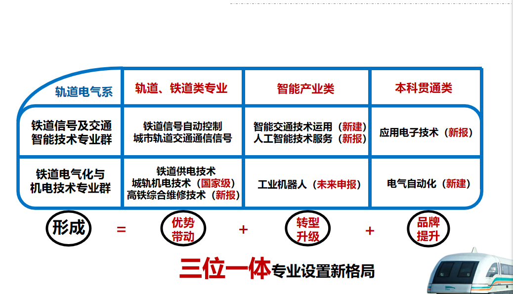 经过持续努力,形成了“轨铁道(优势带动类)+“智能交通(转型升级类)+本科贯通(品牌提升类)”三位一体的专业设置新格局。
