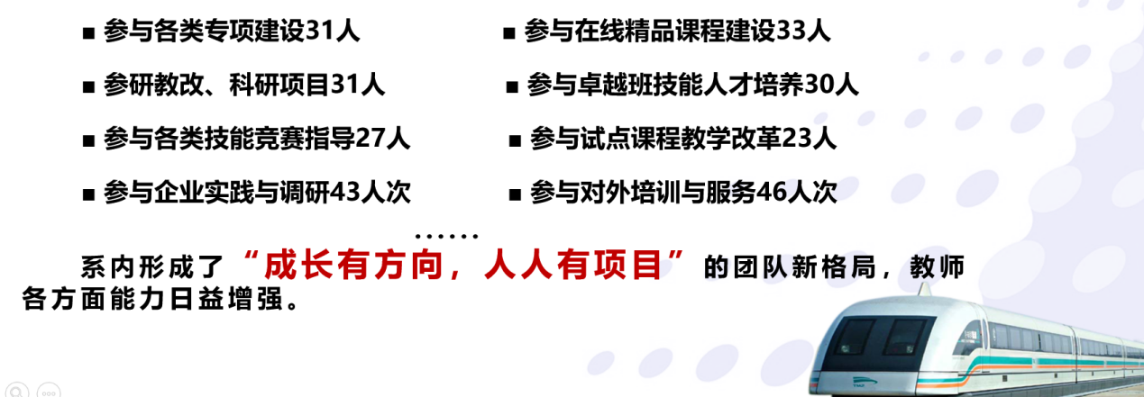 以学院教学质量提升行动计划为抓手,以学院建立教师非教学工作量计算办法为契机,引导教师在完成日常教学以外,积极参与在线课程建设、教学改革、科技创新等活动。一年来,全系教师成功申报市级科研项目3项、市级教改项目2项,院级科研项目3项;在建学院立项的国家级在线公开课程建设3门、市级在线公开课程建设4门、院级在线公开课程建设2门;发表论文20余篇,申报专利11项,形成人人有项目、人人有方向的良好格局。