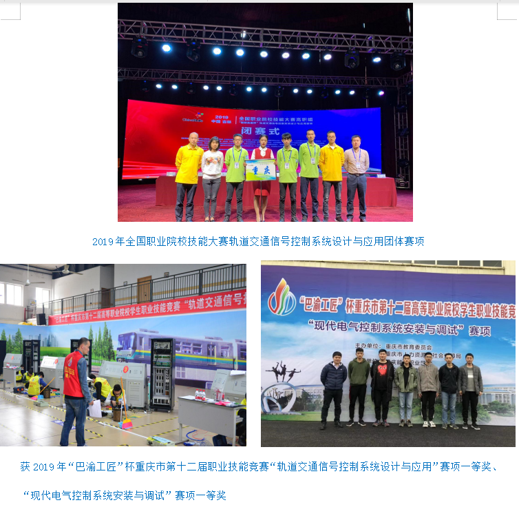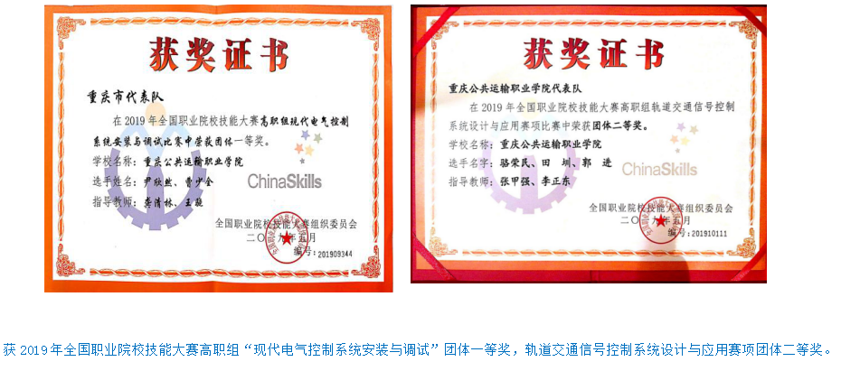 组织学生参加各类学科技能竞赛110人次,并获国家级奖项3项、省部级奖项9项。尤其是获得2019年全国职业院校技能大赛高职组“现代电气控制系统安装与调试”赛项全国一等奖第一名,为重庆争得荣誉。
