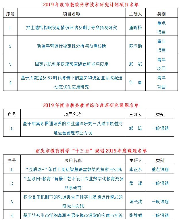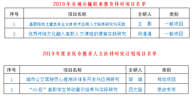 出台《教科研成果奖励办法(试行)》,组织校内专家紧盯当前交通运输业前沿热点问题,积极申报各类课题、开展科研攻关。全年累计获批省部级及以上科研课题立项12项、厅局级立项4项,获得纵向科研经费50余万元。特别是首次获批教育部科技发展中心立项科研项目1项,首次获批重庆市教育综合改革研究课题、交通运输职业教育科研课题等3项,获批重庆市教委重点科技项目1项、重庆市教育科学十三五规划重点项目1项。