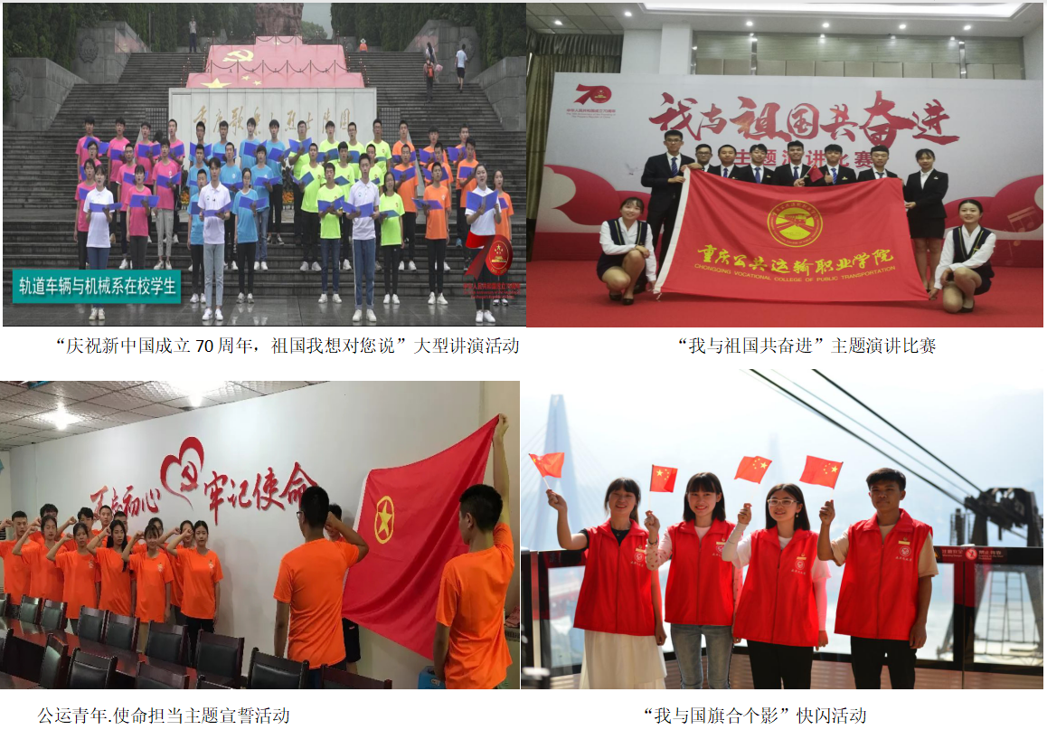 以庆祝中华人民共和国中国成立70周年、纪念“五四运动”100周年为契机,在广大在校学生中开展“祖国我想对您说”“我与祖国共奋进”主题演讲、公运青年·使命担当主题宣誓、“我与祖国共成长”读书分享交流会、“我与国旗合个影”快闪等丰富多彩的主题活动,激发爱国热情,凝聚奋斗力量。