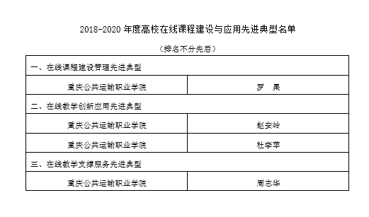 重庆市教育委员会7月30日发出通知,公布2018-2020年度全市高校在线课程建设与应用先进典型名单,重庆交通开投集团所属澳门正规电子游戏平台4人榜上有名,成功入选。