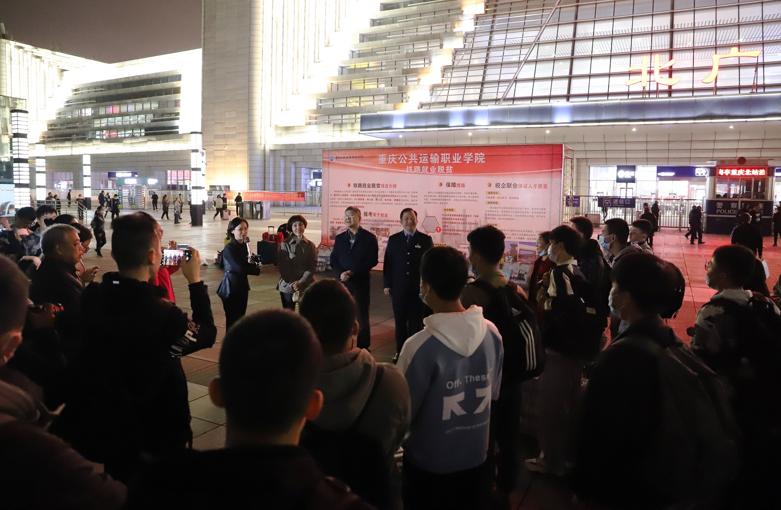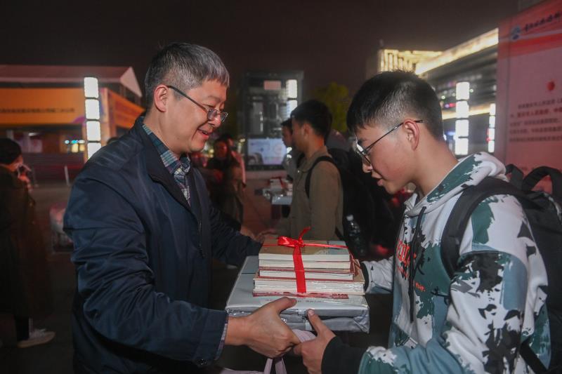 晚上8点,学院在重庆北站北广场举办简短仪式,由学院副院长刘畅和重庆火车站党委副书记黄涛等领导,为“铁路就业脱贫”专项计划9名贫困新生代表发放铁路就业脱贫“筑梦金”,赠送含有床上三件套、枕芯、垫絮、棉絮、图书一套等暖心物品在内的“迎新礼包”,寄语大家珍惜学习机会,在老师、家长和企业的关心、支持下,不断提升自己的思想素质和专业技能,为自己的未来发展添翼赋能。