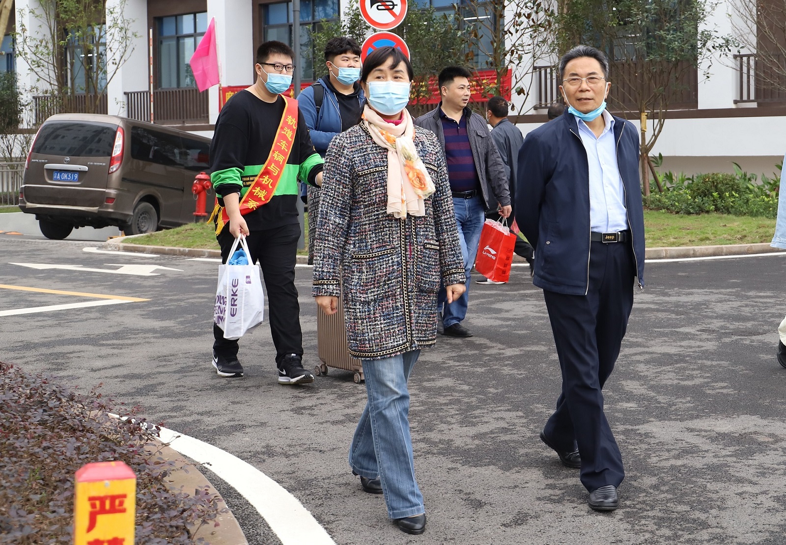 他们有的人手持消毒喷液与体温仪,为新生及家长测量体温、为行李消毒。