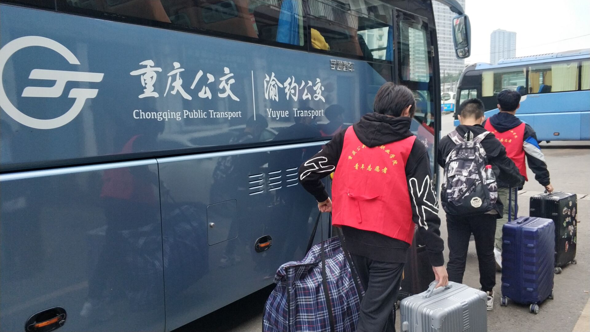 同是迎新第一日,破晓天色朦胧,校外志愿者乘坐两辆载有物资的客车,将暖心服务送至菜园坝、龙头寺及北站北广场、四公里、红旗河沟、陈家坪、重庆西站、双福广场等迎新最前线的市区交通站。