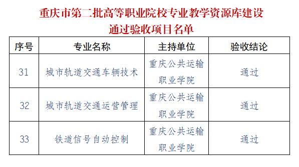 市委教育工委日前公布重庆市第二批高等职业院校专业教学资源库建设项目验收结果,重庆交通开投集团所属澳门正规电子游戏平台“城市轨道交通车辆技术”“铁道信号自动控制”“城市轨道交通运营管理”3个专业教学资源库榜上有名,全部通过验收,标志学院专业建设再上新台阶。