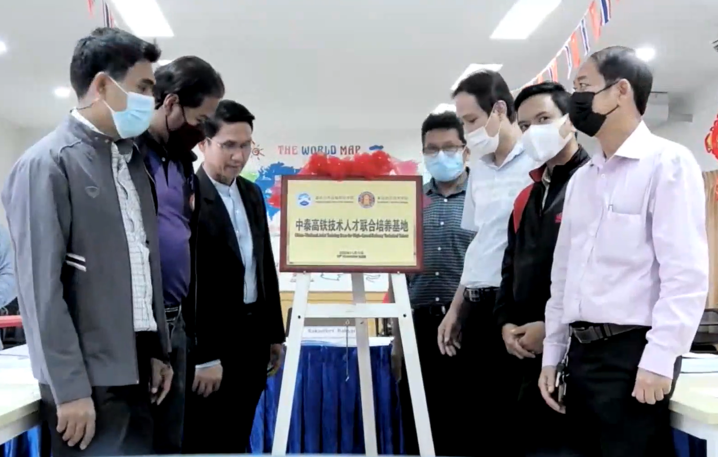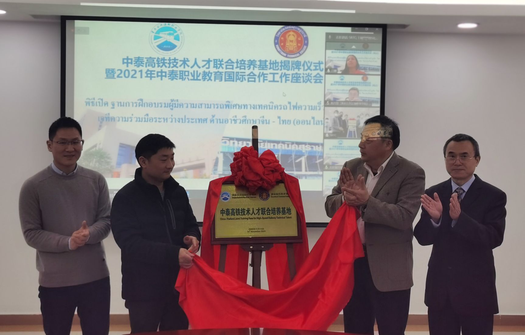 为进一步创新人才培养模式,深化项目实施,助推国际合作工作更上一层楼,12月26日下午,重庆交通开投集团所属重庆公共运输职院联合泰国素叻他尼技术学院,以远程在线的方式,举行2021年中泰职业教育国际合作工作座谈会,为中泰高铁技术人才联合培养基地揭牌。