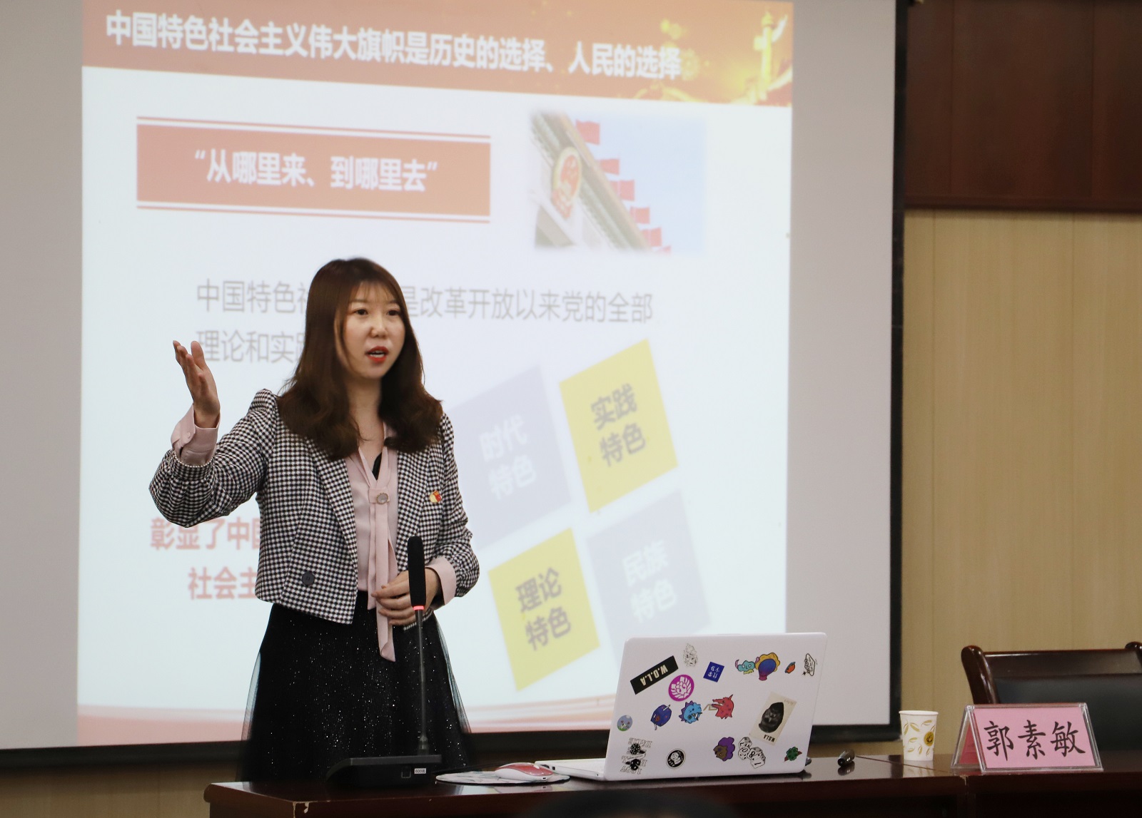 活动邀请思政教研党支部书记郭素敏担任主讲,讲授过程中,郭素敏从中国特色社会主义是历史的选择人民的选择、新时代的内涵和意义、高举中国特色社会主义伟大旗帜、坚定不移坚持和发展中国特色社会主义等方面,对什么是中国特色社会主义理论体系这个问题进行系统阐述。