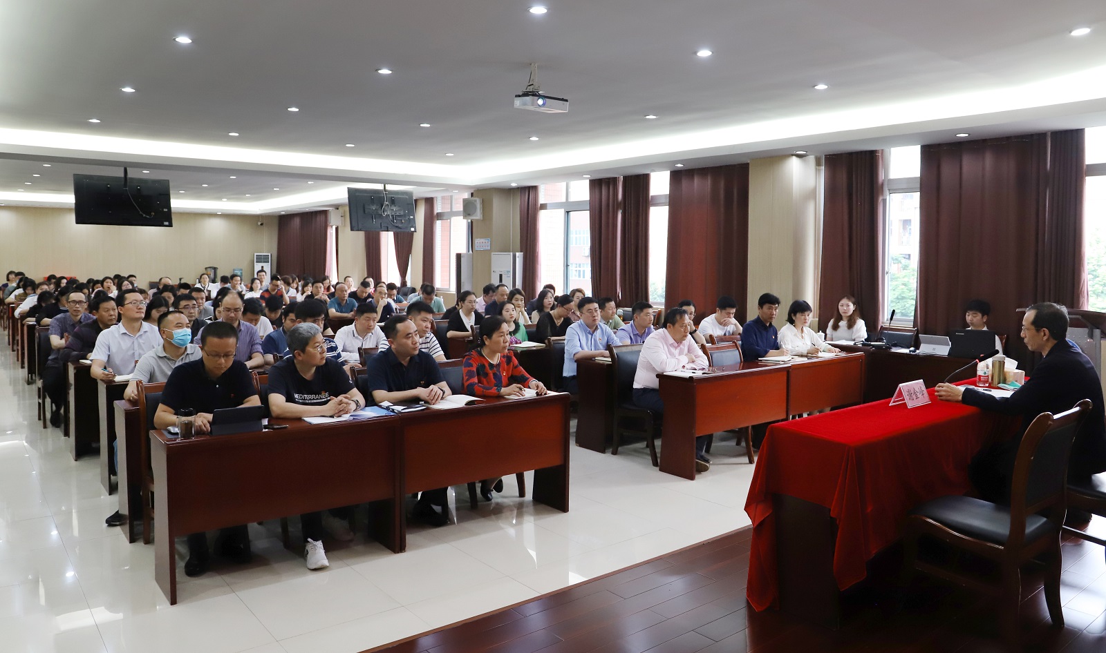校长刘东燕、党委副书记李灿等学校领导班子成员,各党总支(支部)和各部门负责人,全校师生党员代表,共170多人到场聆听。报告会由学校党委书记彭超主持。