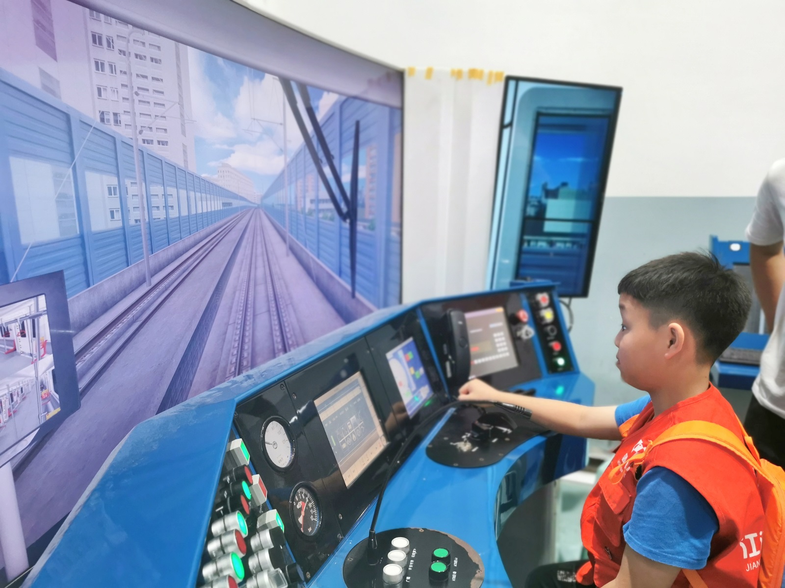 活动中,组织小朋友们走进学校全国城轨与高铁技术共享实训基地,实地参观轨道交通信号、城市轨道交通运营控制、城市轨道交通车辆检修、轨道交通车辆电气控制、轨道交通车辆制动等实训室,组织青年志愿者为他们详细讲解列车驾驶基本技术等专业知识,邀请孩子们模拟体验轨道列车驾驶技术。