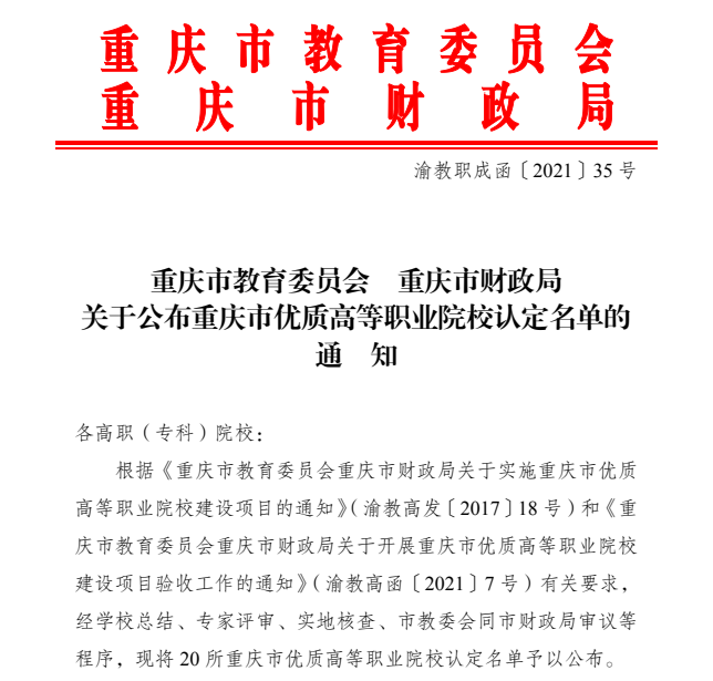 据了解,该名单是根据重庆市优质高等职业院校建设项目实施方案,经学校自查、专家评审、实地核查、市教委会同市财政局审议等程序最终确定的。