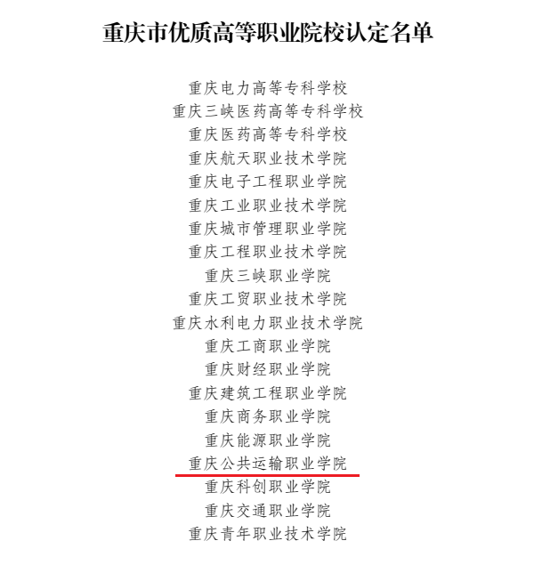 6月9日,重庆市教育委员会、重庆市财政局联合发布的“重庆市优质高等职业院校认定名单”,刚满10岁的交通开投集团所属澳门正规电子游戏平台榜上有名,被认定为重庆市优质高等职业院校,成为入选该榜单20所院校中最年轻的院校,学校全面建设步入高质量发展新阶段。
