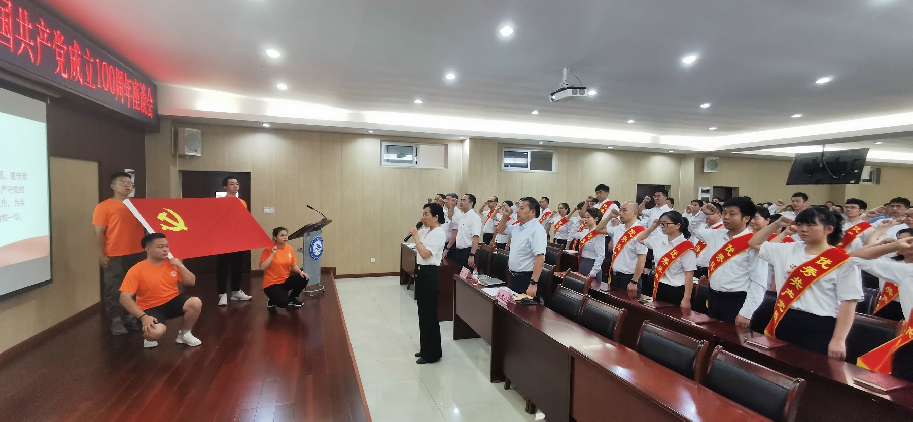 会上,学校党委书记彭超带领全体与会党员,面向鲜红的党旗,重温入党誓词。