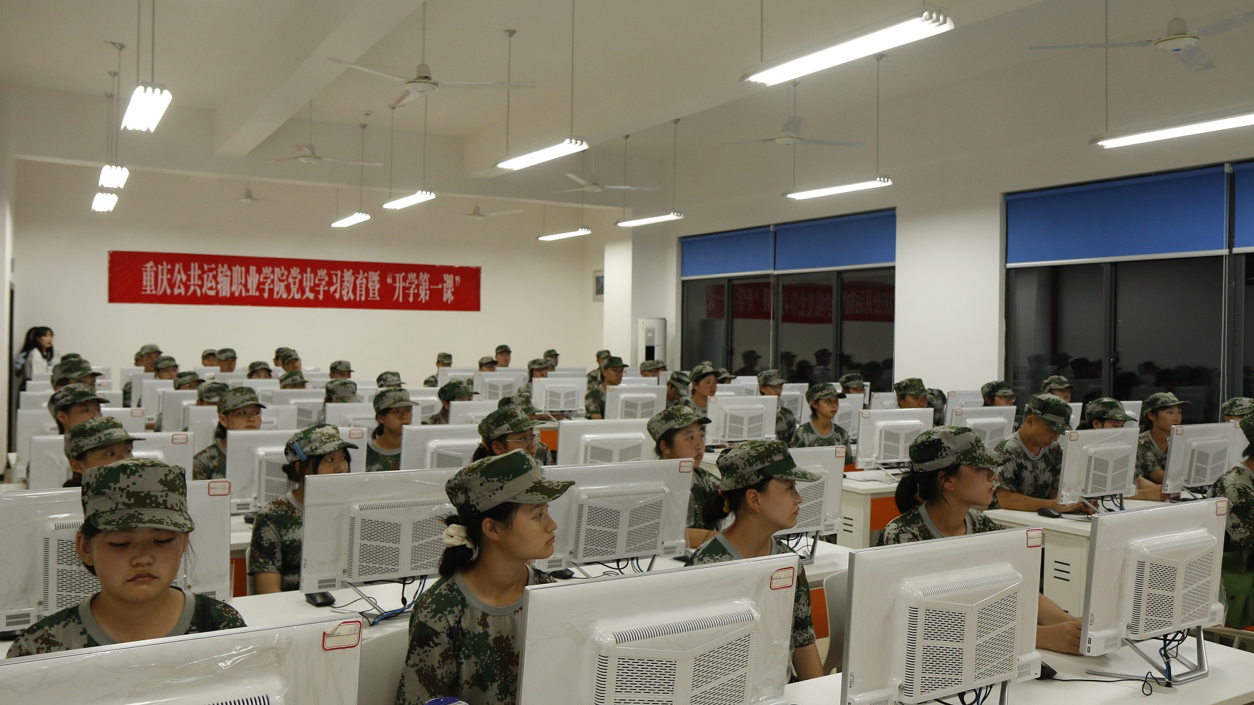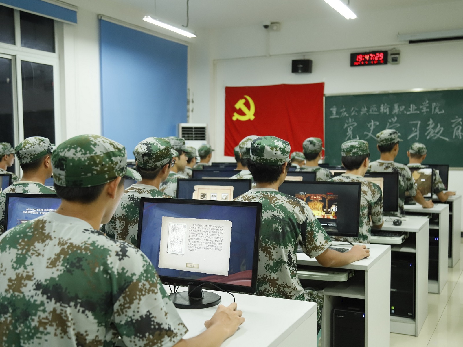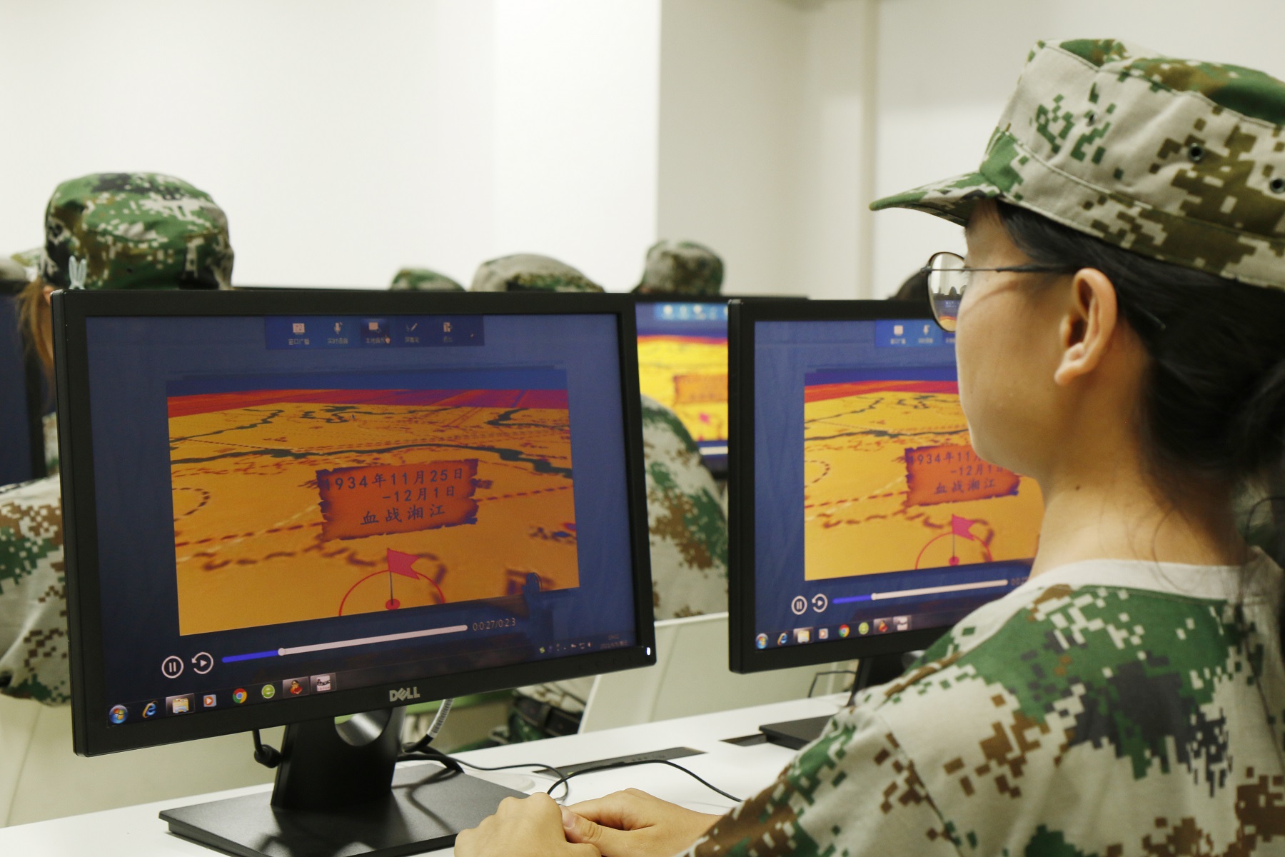 学习过程中,身着迷彩军训装的2000多名新生,分批次通过设在科学城主校区、新校区的10多个机房的600多台电脑里的虚拟仿真系统,利用其中海量文字、图片、视频、档案材料等资源,全方位了解血战湘江、四渡赤水、巧渡金沙江、飞夺泸定桥等一系列经典战例,以沉浸式体验、可视化交互、角色化代入等青年学生喜闻乐见的形式,开展党史学习教育。