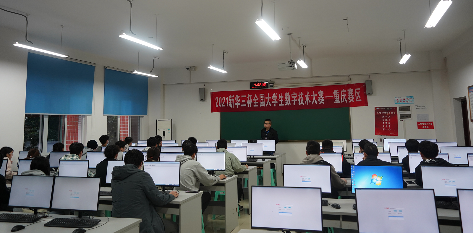 初赛考场设在学校主校区教学楼A栋203、204两间教室,采用笔试+个人赛的形式,主要考察选手对H3C 数字化技术、路由协议、WLAN 技术、以太网交换技术、计算机网络基础知识、网络安全等知识点的掌握情况。