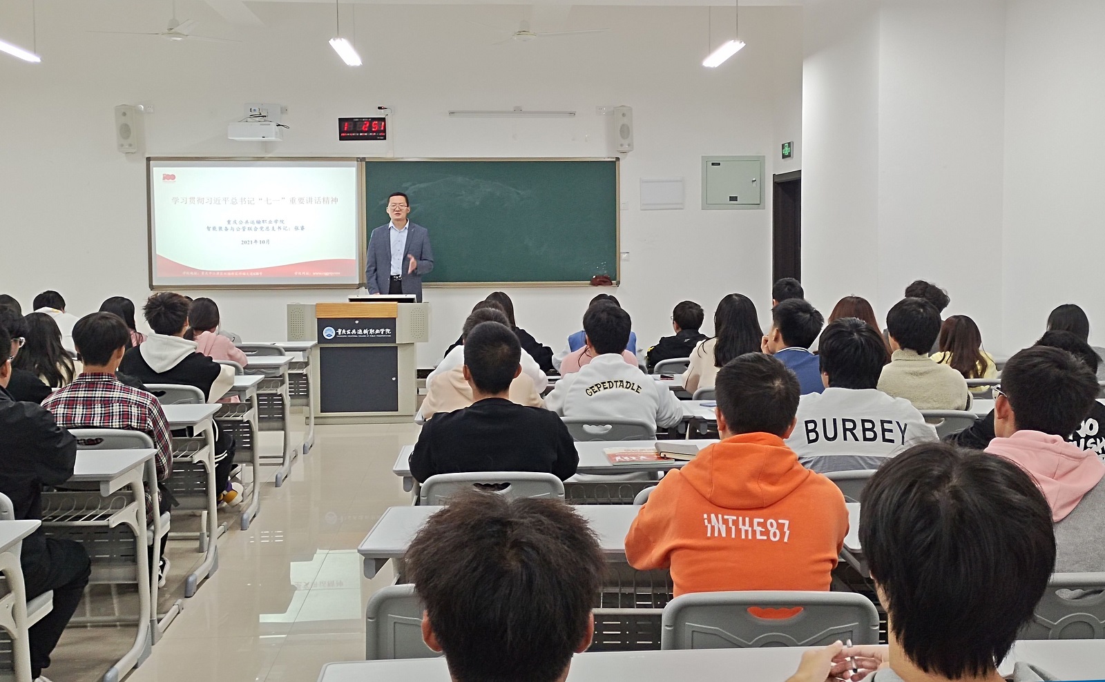 为深化党史学习教育,10月27日下午,智能装备与公管联合党总支在学校新校区教学楼B栋205教室,举办学习贯彻习近平总书记“七一”重要讲话精神“进校园”宣讲。
