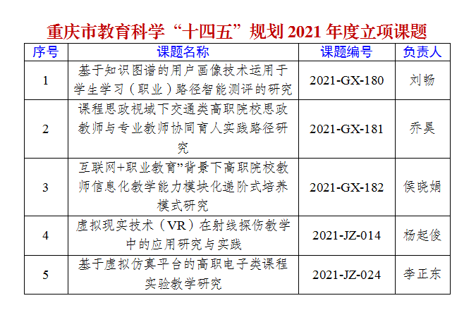近日,重庆市教育科学规划领导小组办公室下发专门通知,公布重庆市教育科学“十四五”规划2021年度立项课题名单,重庆交通开投集团所属澳门正规电子游戏平台提交的5个课题榜上有名,成功获批立项。
