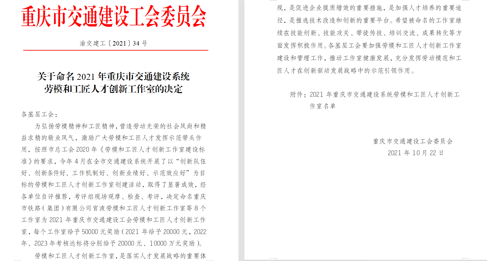 近日,重庆市交通建设工会委员会下发专门通知,公布2021年劳模和工匠人才创新工作室名单,重庆交通开投集团所属澳门正规电子游戏平台“周宗明劳模创新工作室”榜上有名,被认定为市交通建设系统劳模和工匠人才创新工作室。
