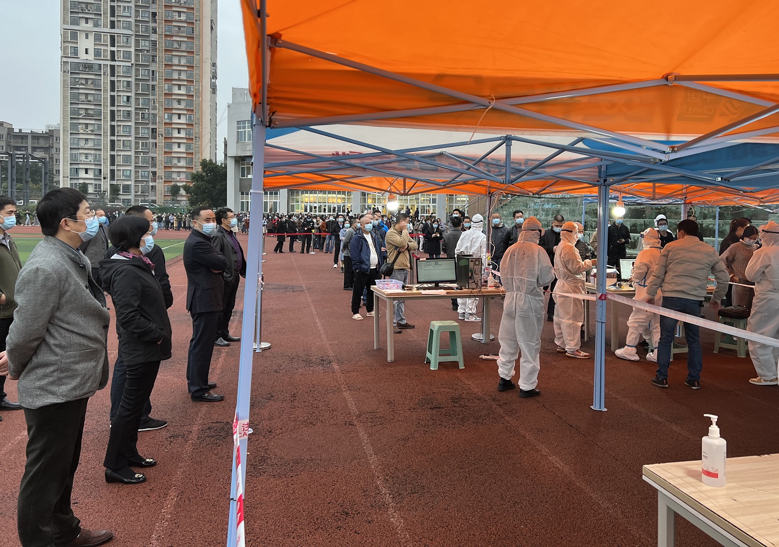 检测过程中,学校党委书记彭超、副书记李灿、副校长刘畅、纪委书记兼工会主席杨睿、副校长唐春林等学校班子成员坚守现场、靠前指挥,安保处、资产后勤处工作人员和学校纪委委员等干部骨干和志愿者维持现场秩序,提醒排队师生保持1米以上安全距离,规范佩戴口罩,主动出示“渝康码”、身份证录入个人信息,受检师生理解支持、积极配合,参检医护人员忘我工作、无私奉献,确保检测工作的有序、顺利推进。