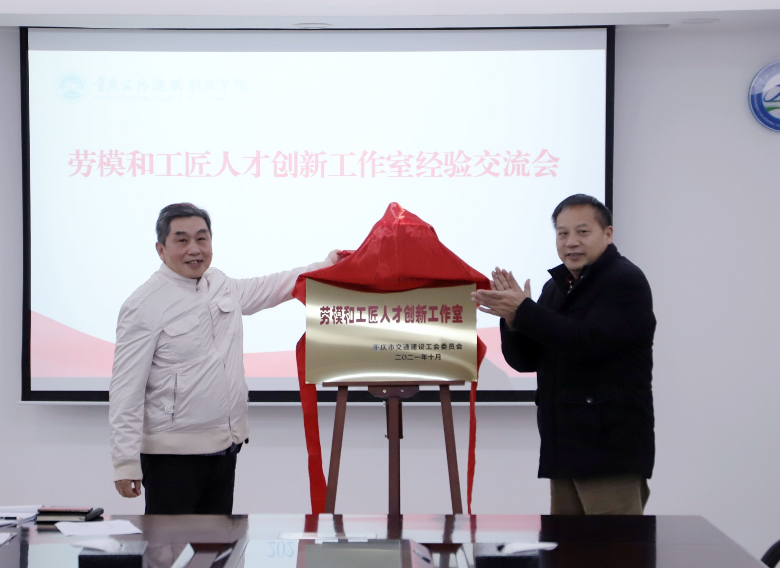 校长刘东燕宣读《关于命名2021年重庆市交通建设系统劳模和工匠人才创新工作室的决定》,校领导为周宗明劳模和工匠人才创新工作室进行授牌。