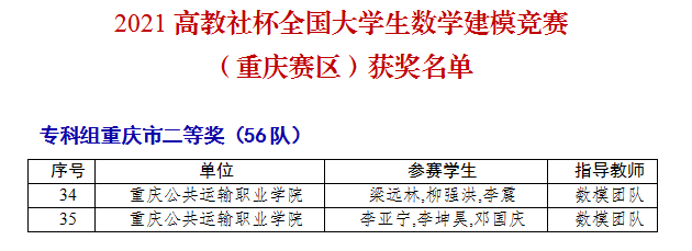 重庆市教育委员会近日发出专门通报,公布2021高教社杯全国大学生数学建模竞赛重庆赛区获奖名单,重庆交通开投集团所属重庆公共运输职院榜上有名,选派的2支学生参赛队伍均获专科组二等奖。