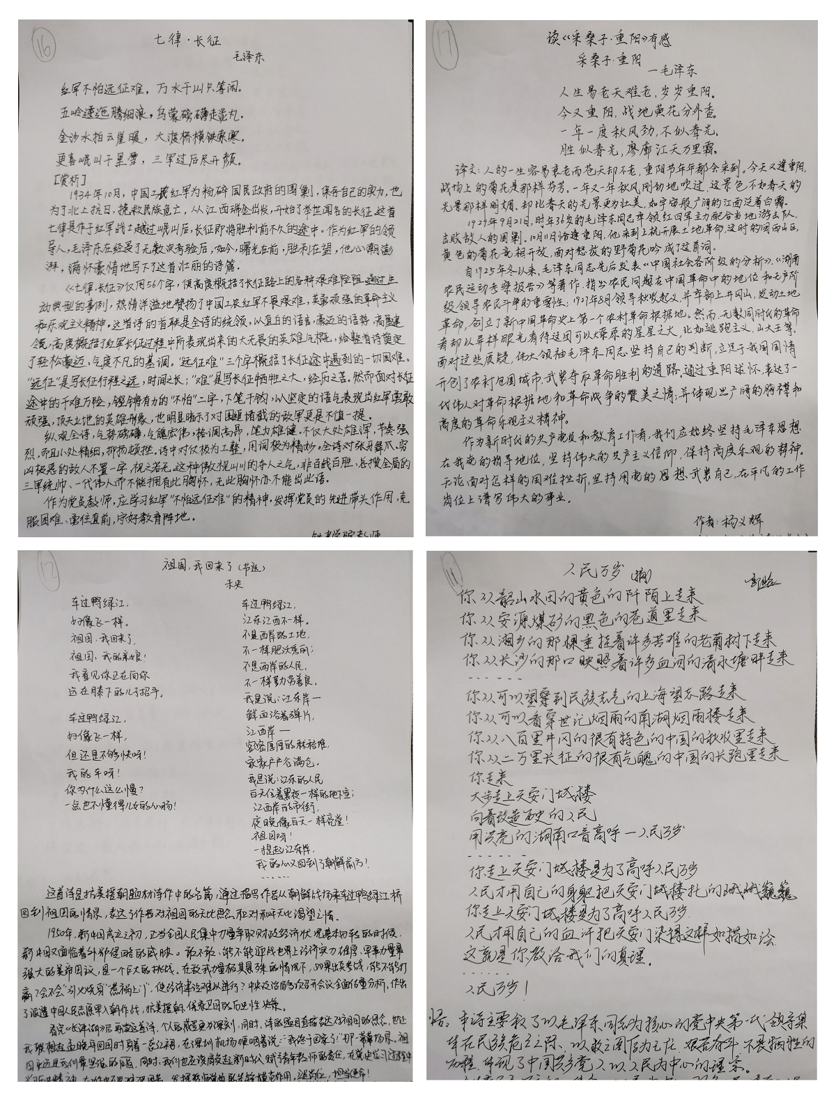 活动中,通过组织党员师生书写《七律·长征》《采桑子·重阳》《人民万岁》等红色经典诗词,重温一百年来,中国共产党团结带领中国人民,以“为有牺牲多壮志,敢教日月换新天”的大无畏气概,开辟的伟大道路、创造的伟大事业、取得的伟大成就,从中汲取奋进的智慧和力量。