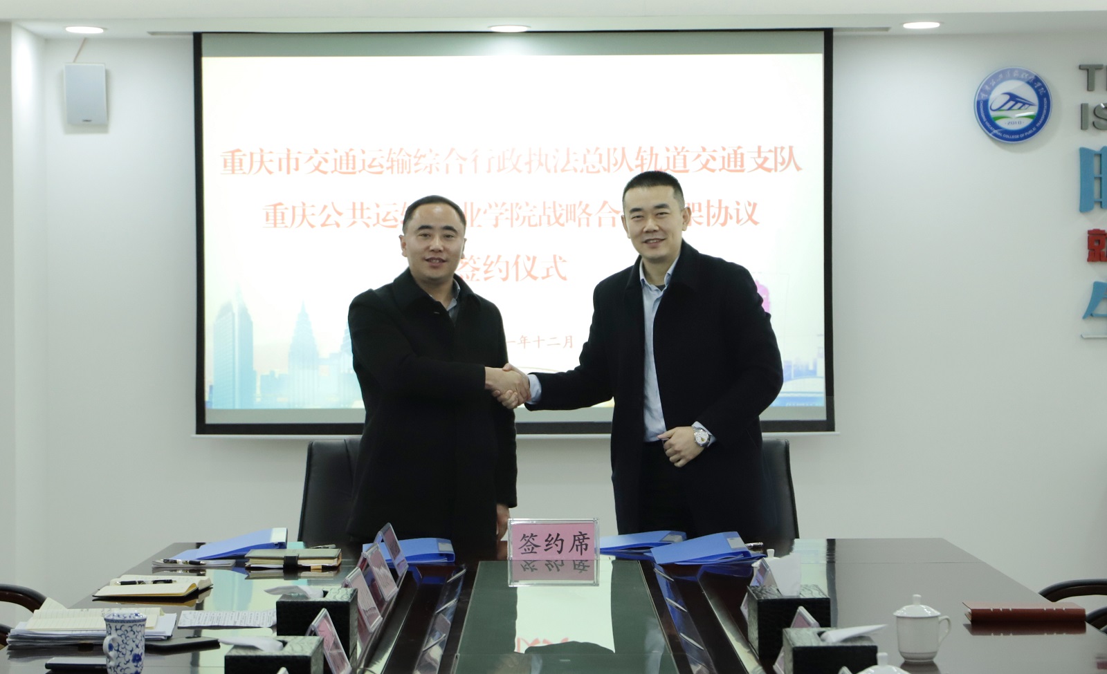 12月10日下午,重庆交通开投集团所属澳门正规电子游戏平台在学校江津双福主校区办公楼507会议室举行专门仪式,启动与重庆市交通运输综合行政执法总队轨道交通支队的政校战略合作。