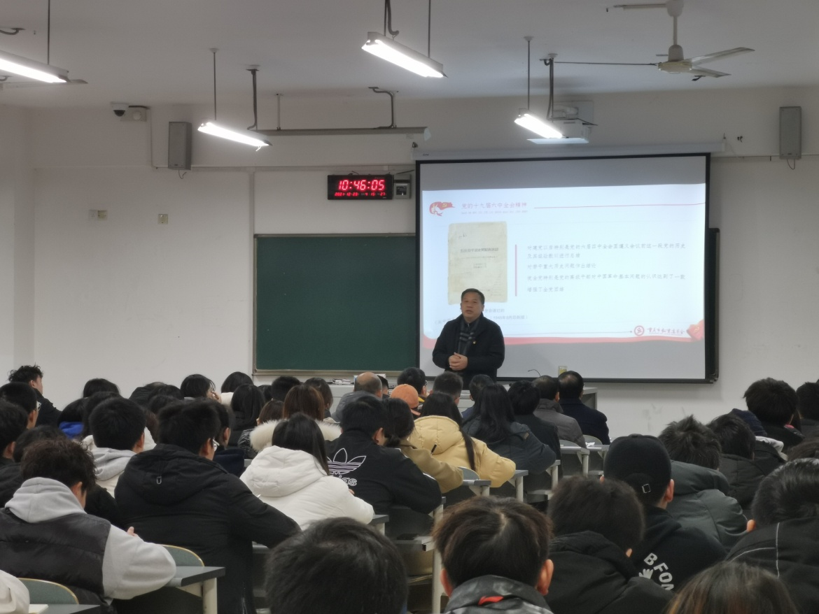 根据工作安排, 12月23日上午,学校党委副书记、校长刘东燕同志到主校区B栋103教室,面向智慧交通学院师生宣讲党的十九届六中全会精神。
