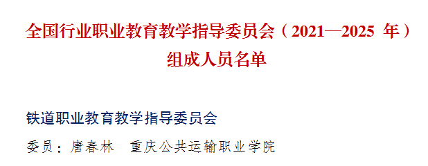 教育部近日公布2021—2025年全国行业职业教育教学指导委员会组成人员名单,重庆交通开投集团所属澳门正规电子游戏平台副校长唐春林教授榜上有名,入选铁道职业教育教学指导委员会委员。